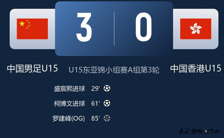 下半场中国队连接猛攻,第51分钟,盛宸熙送助攻,柯博文抽射破门,中国U15 2-0开头。第66分钟,余靖钰禁区外回身抽射,皮球略微跨越横梁。第74分钟,中国U15角球平直攻门,罗建峰扑救动手将球扑入球门,最终国足3-0打败敌手成效保级。
