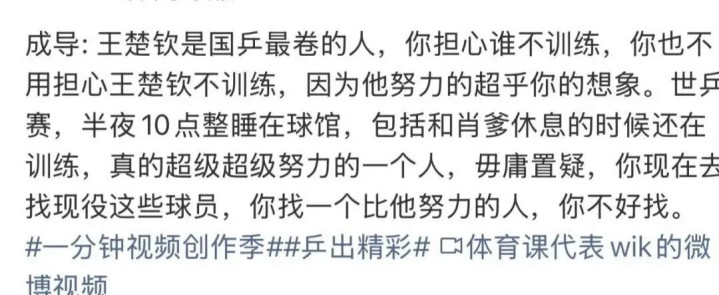 这不,算作全网领有几十万粉丝的大V,成导就在某平台的直播中说王楚钦是通盘这个词中国乒乓球队现役队员中最卷的,他不仅起得早、睡得晚,何况历练最刻苦,旧年多哈世乒赛时刻以致睡在球馆。